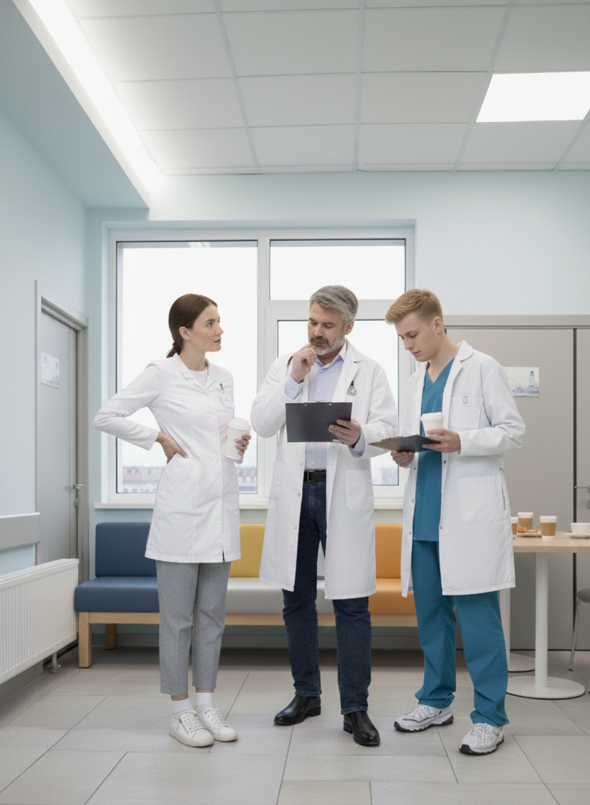 In Gruppenkursen oder auch mit Einzeltraining vermitteln wir Wissen über das deutsche Gesundheitssystem im internationalen Vergleich, sowie deutsche Krankenhausstrukturen.